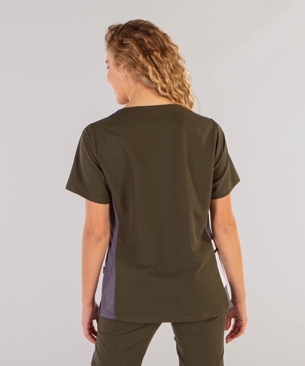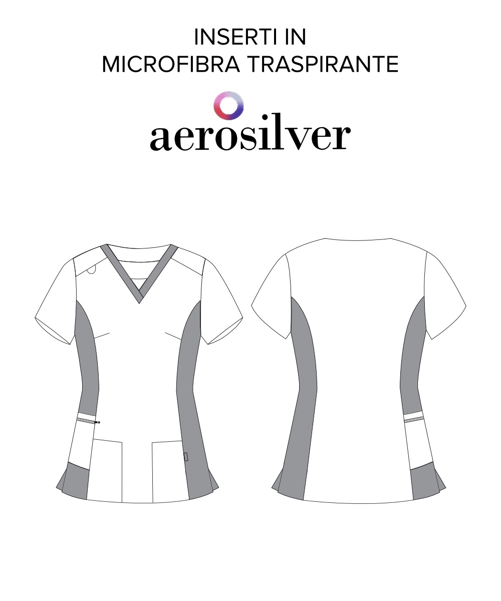 - Casacca a V da donna a maniche corte bicolore realizzata in leggera e confortevole Microfibra 360 elasticizzata.