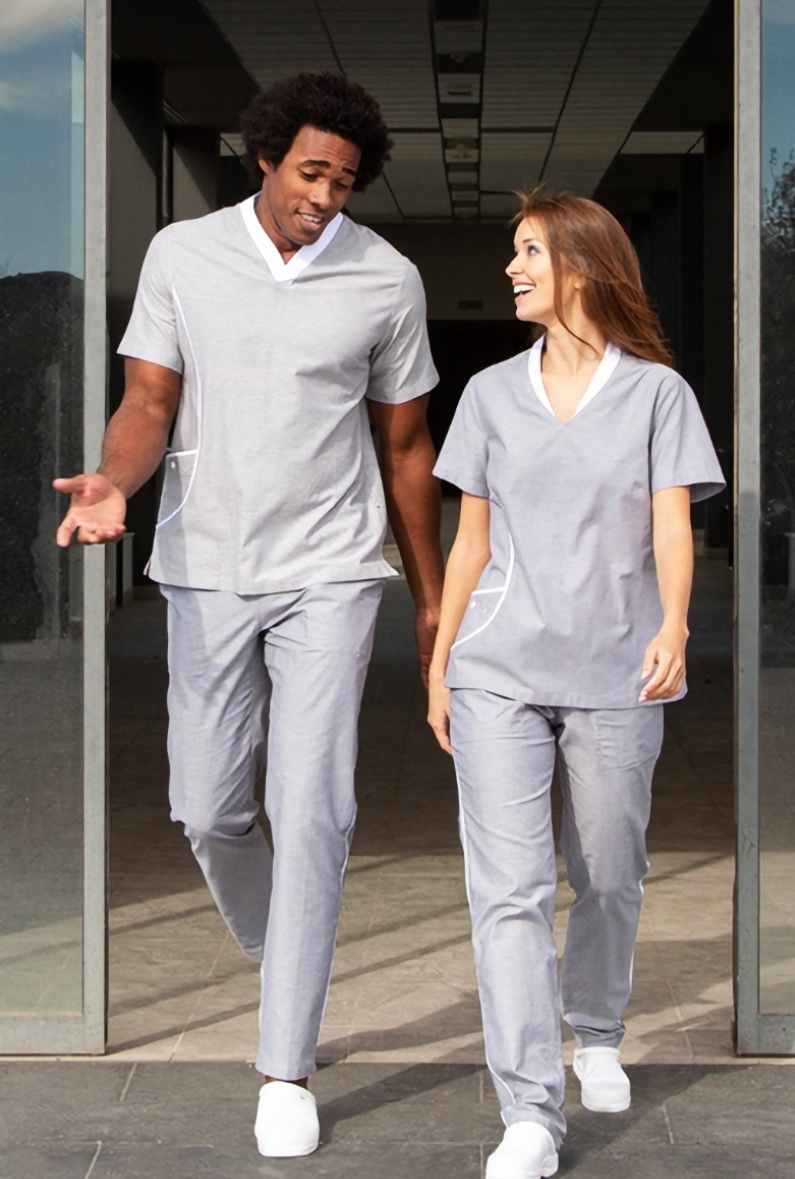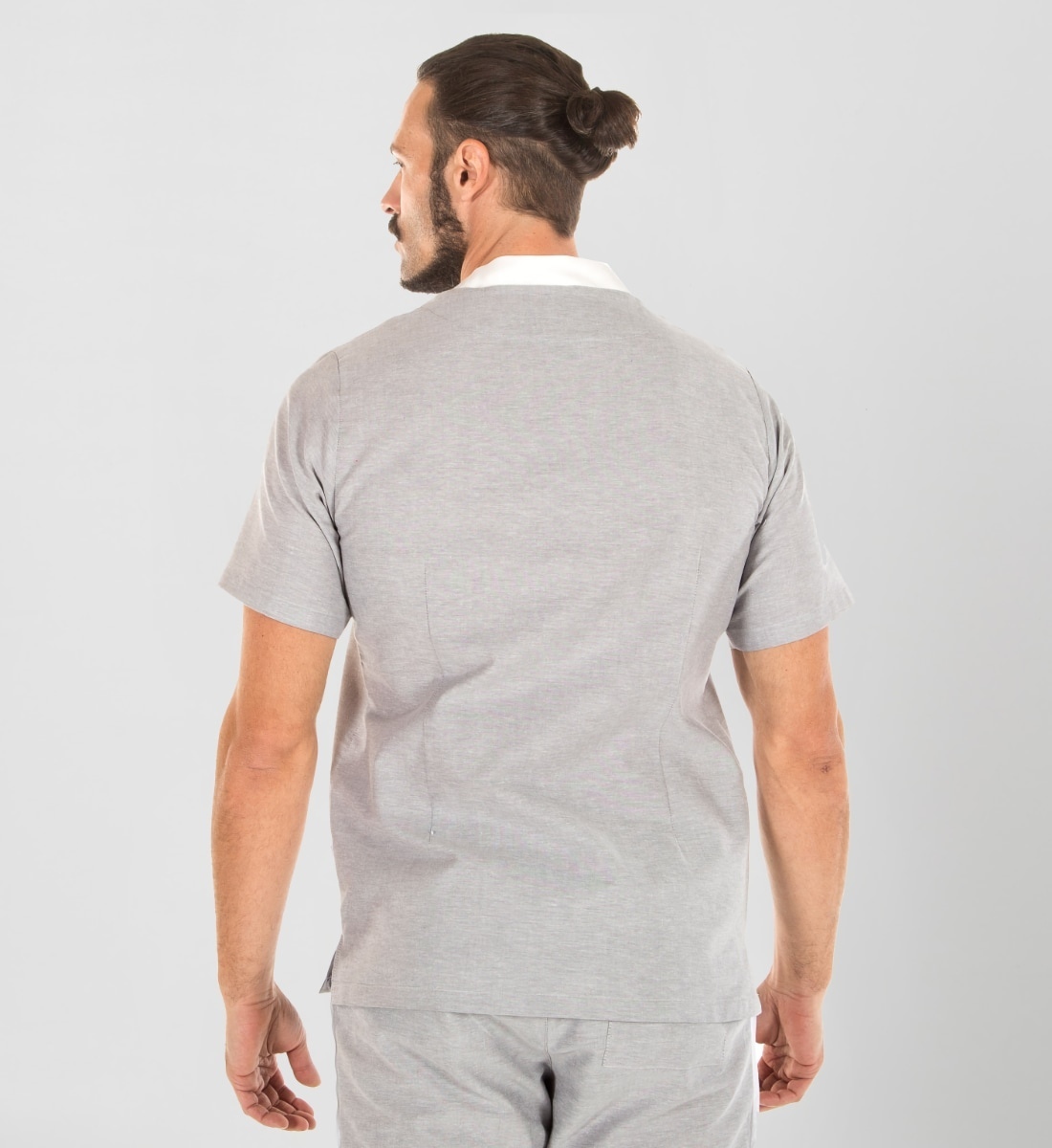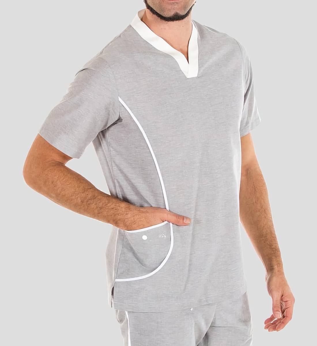 Elegante e leggera casacca a V da donna realizzata in tessuto oxford. Vestibilità semiaderente, con pinces sul retro e spacchetti laterali. Tasca in basso a destra. Disponibile in grigio perla, abbinato al bianco sul collo e profilo sul fianco e sulla tasca Stiro facile.