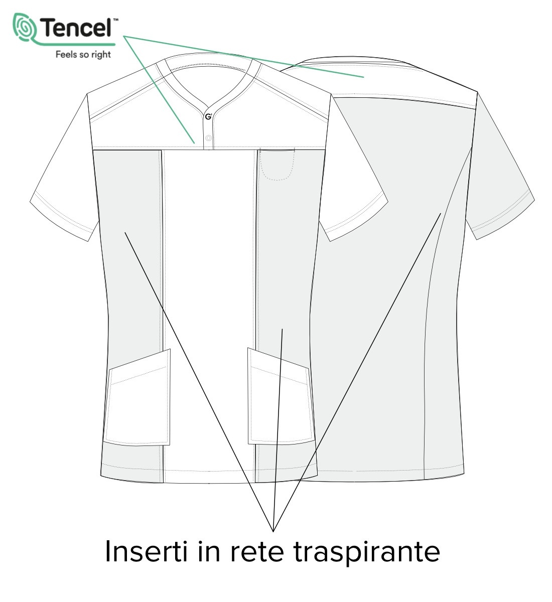 Il Tencel® è un tessuto tecnico di nuova generazione derivato dalla cellulosa di legno che presenta caratteristiche di estrema morbidezza, freschezza e comfort sulla pelle insieme ad un'alta traspirabilità e resistenza. Assicura così una riduzione dell'umidità del 50% in più rispetto al cotone, isolando e mantenendo il corpo fresco ed asciutto riducendo inoltre la proliferazione dei batteri. E' inoltre estremamente biodegradabile, quindi rispettoso dell'ambiente e facile da mantenere e stirare. Composizione: 50% lyocell - 50% poliestere.