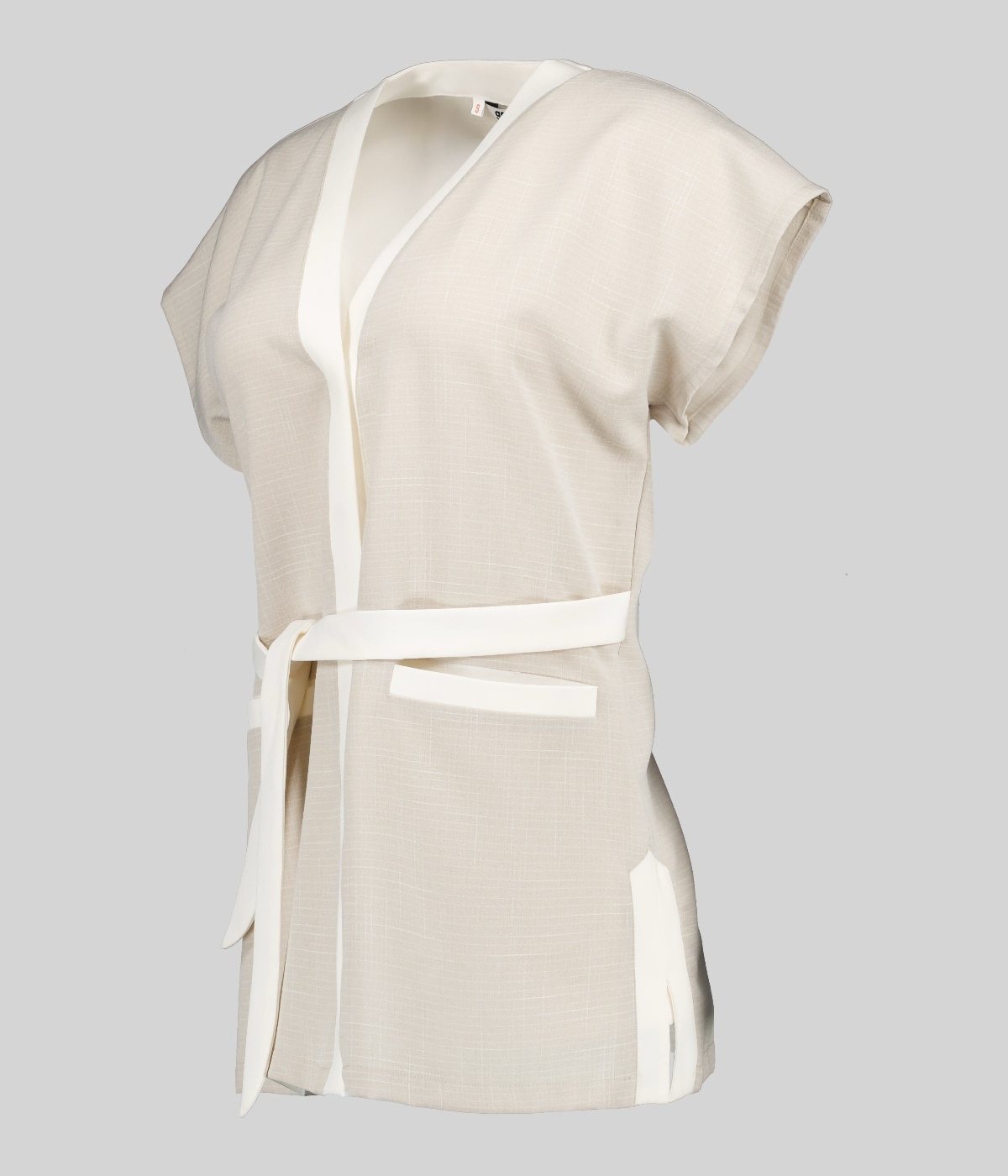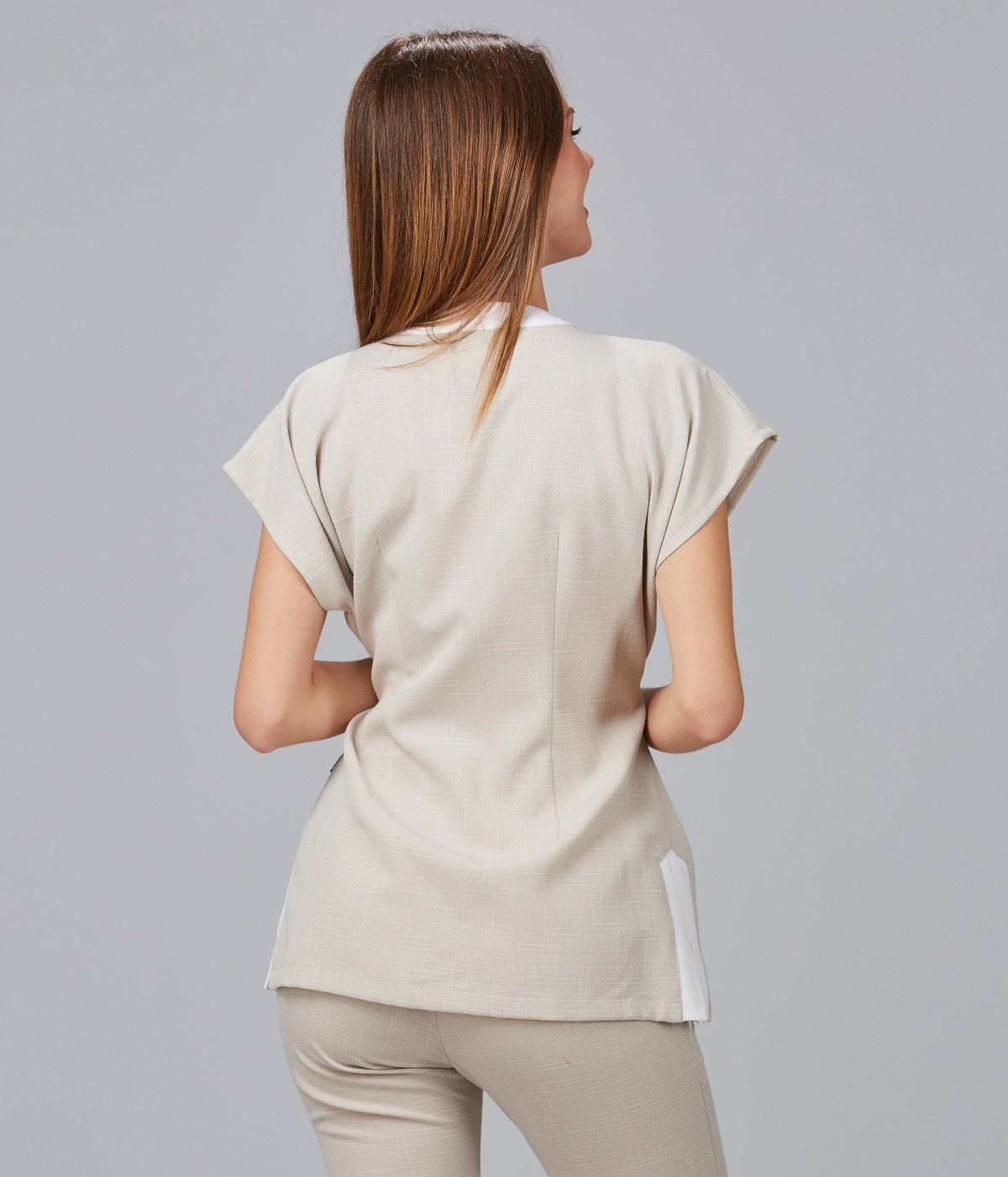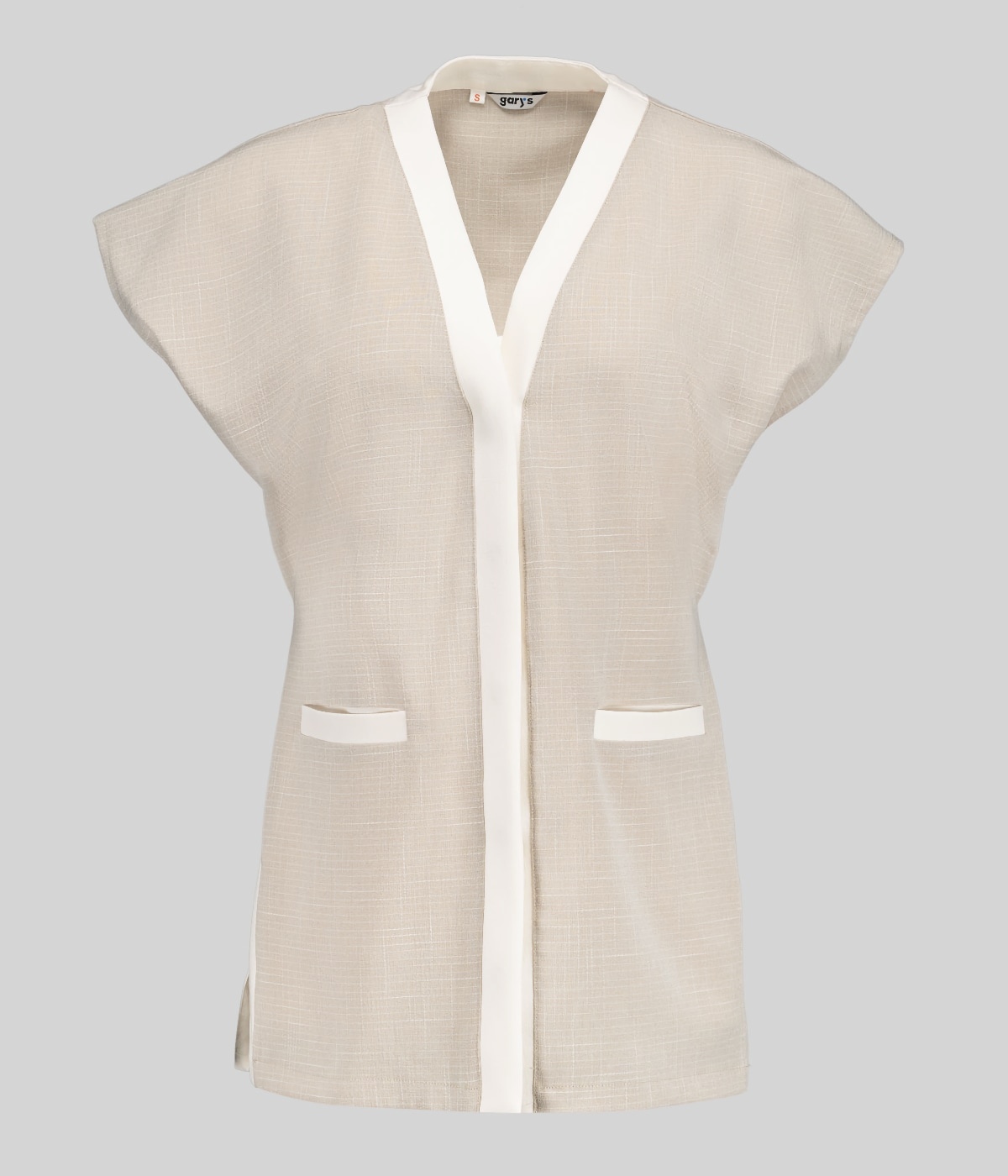 Casacca da donna a maniche corte con elegante scollo a v realizzata in x.linen, tessuto elasticizzato simile al lino. In carré anteriore e le due tasche frontali, offrono funzionalità e uno stile unico Questa casacca semi-aderente è dotata di pinces sul petto e sulla schiena per una vestibilità perfetta.